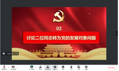 会议讨论黄永洲、王佩荣二位同志转为发展对象问题。首先,入党积极分子黄永洲、王佩荣二位同志分别向大会汇报了自己的政治思想、学习生活近况,吴刚、郑然同志和宋思、甄真同志分别对他们的情况发表评价。接着,按照《中国共产党章程》等有关规定与程序,采用线上无记名投票的方式,12名正式党员一致同意黄永洲、王佩荣二位同志转为党的发展对象。二位同志发言表示会不断提升自己,向党组织靠齐。