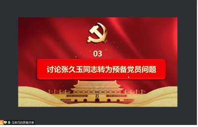 会议第项内容,讨论张久玉同志转为预备党员问题。首先,张久玉同志宣读了自己的《入党申请书》。入党介绍人吴刚等同志介绍了其近期的政治思想、学习生活情况并发表了本人意见。接着,按照《中国共产党章程》等有关规定与程序,采用线上无记名投票的方式,11名正式党员一致同意张久玉同志转为预备党员。张久玉同志表达了不断提高政治素养的决心。