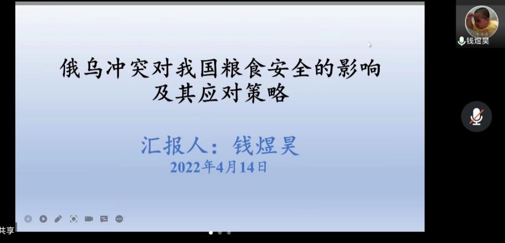 2022年4月14日,yl23411永利集团官网教工支部在线上开展党支部集体学习活动,会议由支部书记钱龙老师主持。此次集体学习结合yl23411永利集团官网业务特色,由钱煜昊老师做了主题为《俄乌冲突对我国粮食安全的影响及其应对策略》的分享。