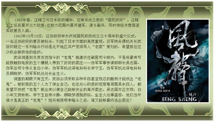 《风声》作为一部向国庆60周年献礼的影片,主要讲述了抗日战争时期,因一汪伪政府的高官被暗杀,引起日军高度重视,日军头领怀疑伪军情报机关内五名官员有一个是内奸“老鬼”,这个“老鬼”极可能与抗日组织有亲密关系。为了找出“老鬼”,日军和伪军对行政收发专员顾晓梦(周迅饰)、译电组组长李宁玉(李冰冰饰)、伪军剿匪大队长吴志国(张涵予饰)、剿匪司令的侍从官白小年(苏有朋饰)以及军机处处长金生火(英达饰)五人进行了审问,这过程经历了从心理战到酷刑的重重考验。